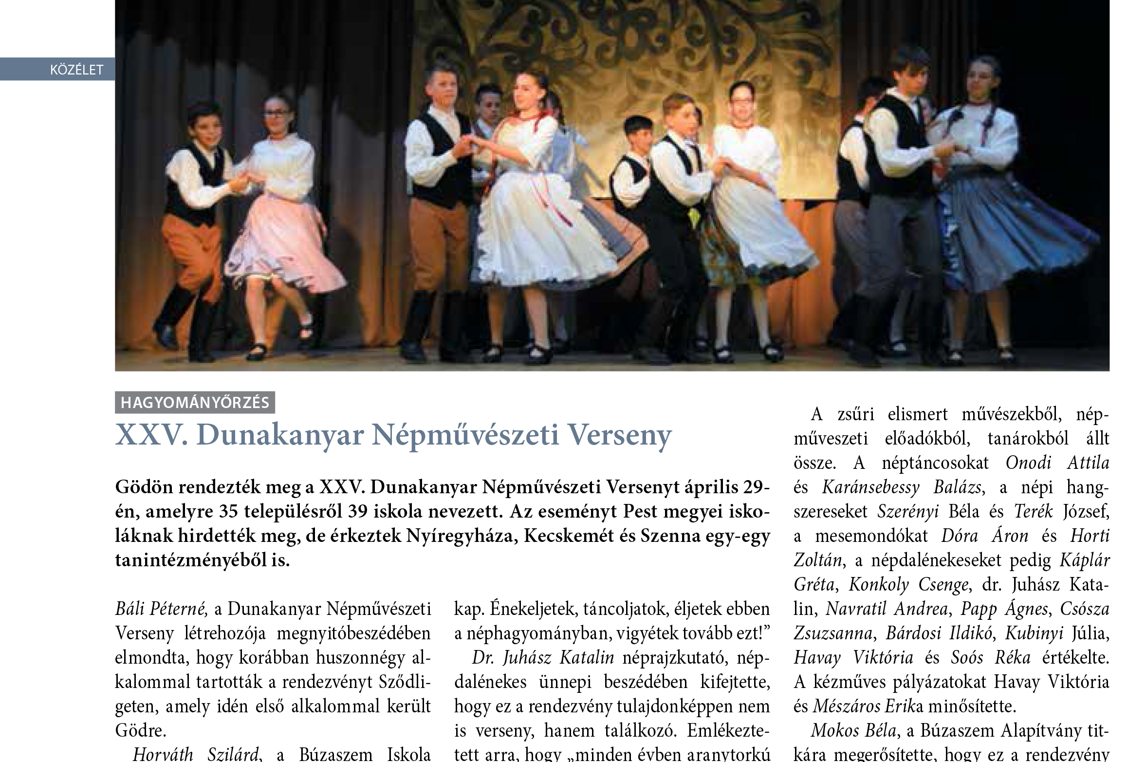 Negyed évszázadot megélve Pest megye tekintetében is a kiemelt kulturális örökségvédelmi rendezvények sorát erősíti a Dunakanyar Népművészeti Találkozó, mely élő példája lehet annak, hogy a hagyományteremtő, fiatalok tehetségsegítése céljából útjára indított kezdeményezések miként lesznek a fiatalok, a szülők, a pedagógusok közös kapcsolódásai.
